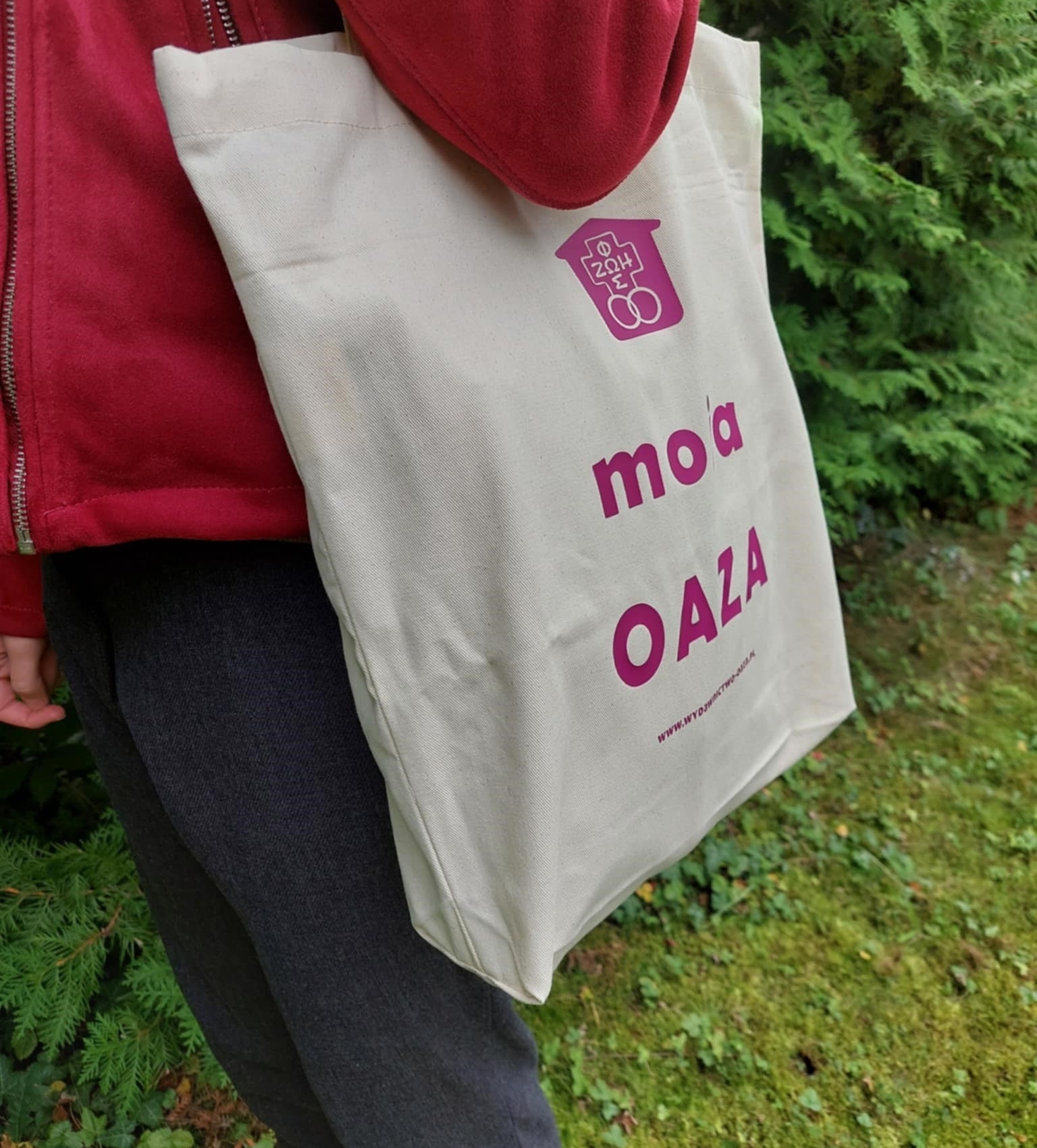 Wysokiej jakości, z grubej bawełny torba ze znakiem Domowego Kościoła i tekstem MOJA OAZA.