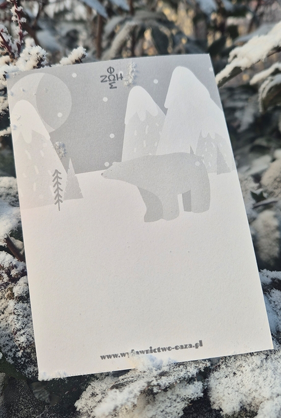 Kartka zadrukowana obustronnie, matowa folia i lakier.