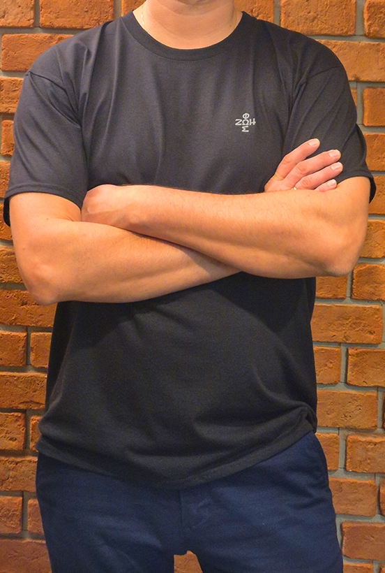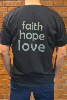 Koszulka męska ze znakiem ΦΩΣ-ΖΩΗ, na plecach tekst FAITH, HOPE, LOVE. Nadruk na koszulce nawiązuje do listu św. Pawła do Koryntian: