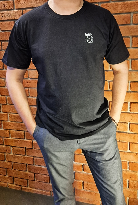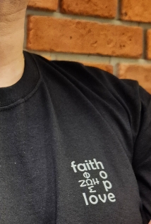 Koszulka męska z tekstem FAITH, HOPE, LOVE i ze znakiem ΦΩΣ-ΖΩΗ. Nadruk na koszulce nawiązuje do listu św. Pawła do Koryntian: