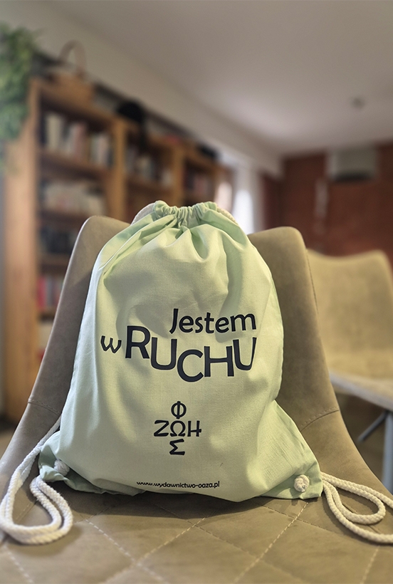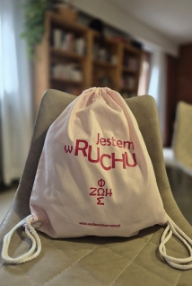 Bawełniany plecak / worek z nadrukiem JESTEM W RUCHU i znakiem FOS-ZOE.