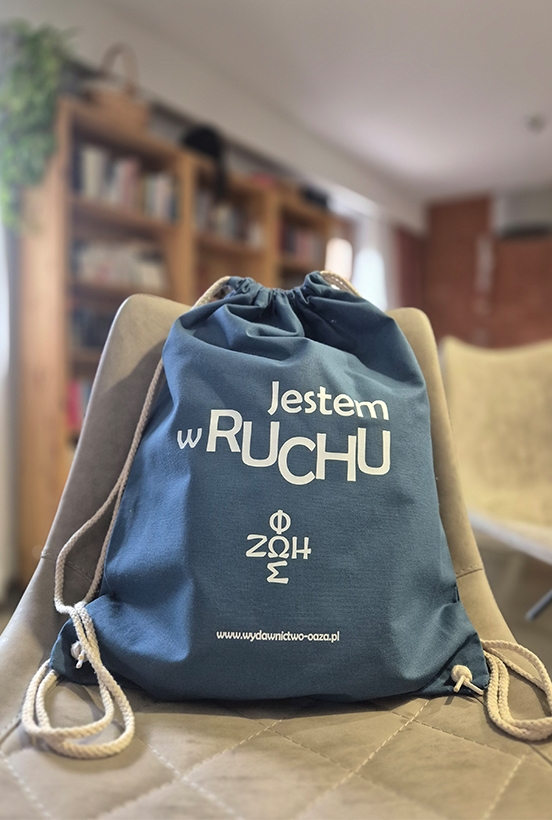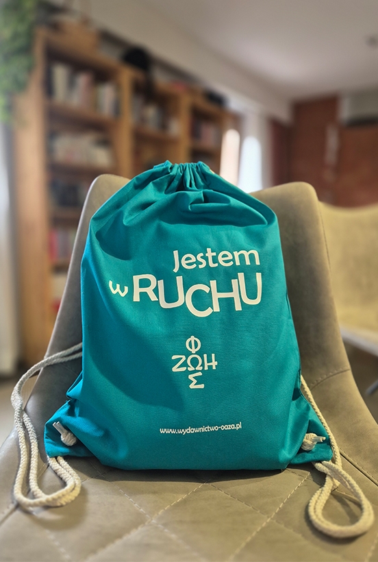 Bawełniany plecak / worek z nadrukiem JESTEM W RUCHU i znakiem FOS-ZOE.